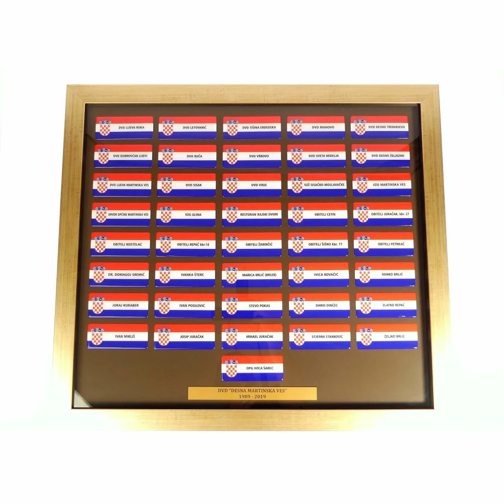 U našoj ponudi možete pronaći potpuno novi dizajn vatrogasnih traka u obliku 3D pločica. Na pločici je podloga u obliku hrvatske zastave, a dodatno je otisnut i natpis. Moguće je naručiti sve zajedno u okviru sa staklom koji se izrađuje u zavisnosti od količine naručenih pločica (traka).